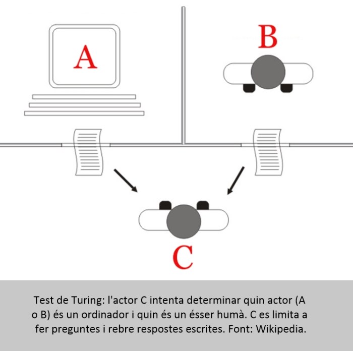 Més complexa i rellevant és la qüestió inversa: que la persona usuària pugui determinar si és intel·ligent la màquina o sistema amb què interactua. Evidentment el GPS és molt llest dins del seu propi i precís domini. Per evitar l’enorme escull de definir intel·ligència, el matemàtic anglès Alan Turing va proposar fa tres-quarts de segle un test operatiu conegut com a “Test de Turing”, també anomenat imitation game. Abans de prosseguir, diguem que Alan Mathison Turing (1912-1954), “pare” de la informàtica teòrica, fou un geni com pocs hi ha hagut, capaç en la seva curta vida de modelitzar el concepte d’ordinador de propòsit general i de fer aportacions en camps com la criptografia i la biologia teòrica. Durant la Segona Guerra Mundial va treballar en el desxiframent dels codis alemanys de comunicació naval. Turing es va suïcidar abans de complir 42 anys davant la disjuntiva de ser empresonat per actes homosexuals o ser castrat químicament. Tanmateix va quedar oberta la possibilitat de mort accidental i la seva mare mai va acceptar el veredicte de suïcidi.[4]